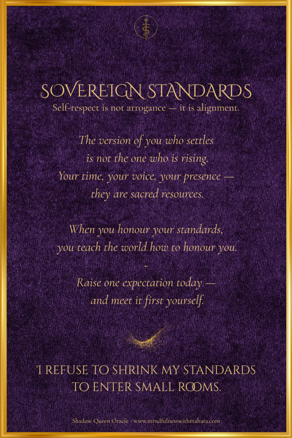 This card arrives when you’ve been tolerating too much, settling too quickly, or accepting less than what honours your truth. Sovereign Standards calls you back into alignment with what you know you deserve—but stopped asking for.