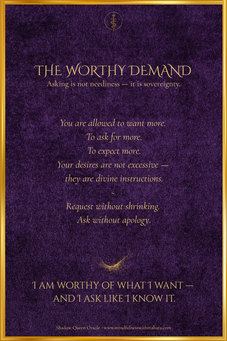 The Worthy Demand appears when you’ve outgrown the crumbs, the maybes, the almosts, and the “good enoughs.” This card is a call to step into your full value and to ask for what aligns with your truth, your standards, and your sovereignty.