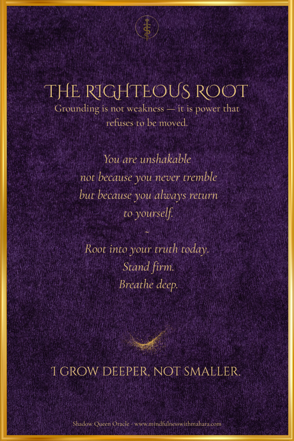 The Righteous Root appears when your soul needs grounding — not just mentally or emotionally, but spiritually, ancestrally, energetically. This card reconnects you to the deep truth that you are supported by forces older and wiser than your fear.