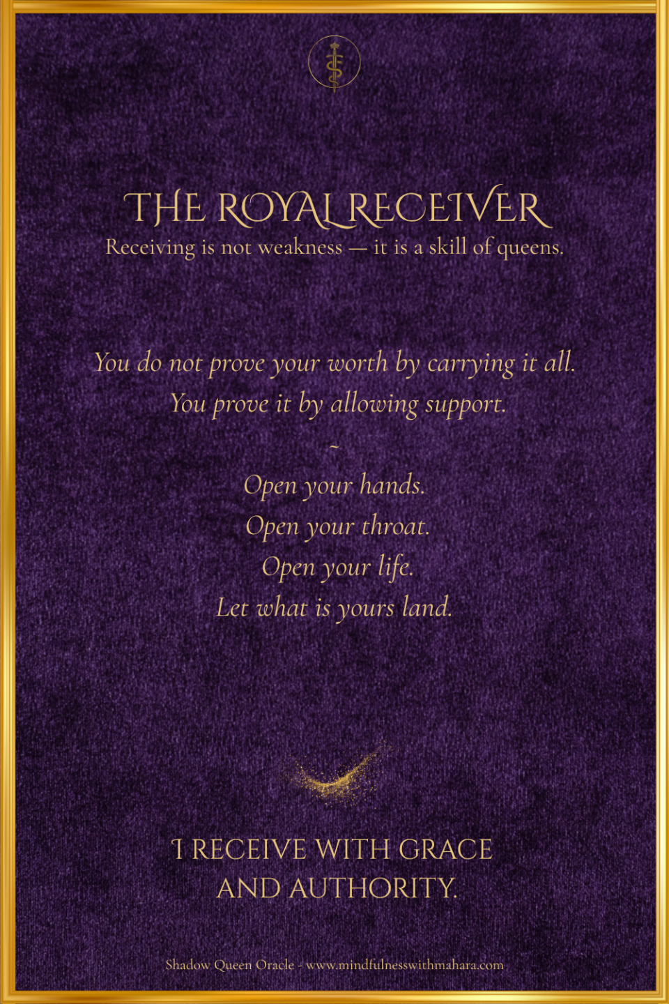The Royal Receiver appears when you’ve been over-functioning, overgiving, or over-efforting to earn what was always meant for you. This card invites you into the feminine truth that you do not have to chase what is aligned.