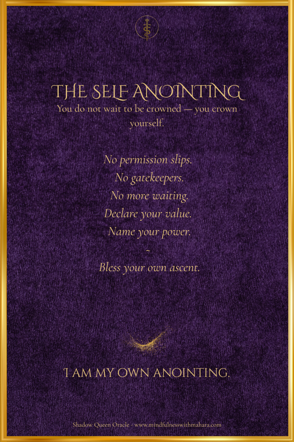 The Self-Anointing appears when you’ve been waiting for affirmation, approval, recognition, or permission from the outside world — when in truth, your next chapter requires you to declare your worth.